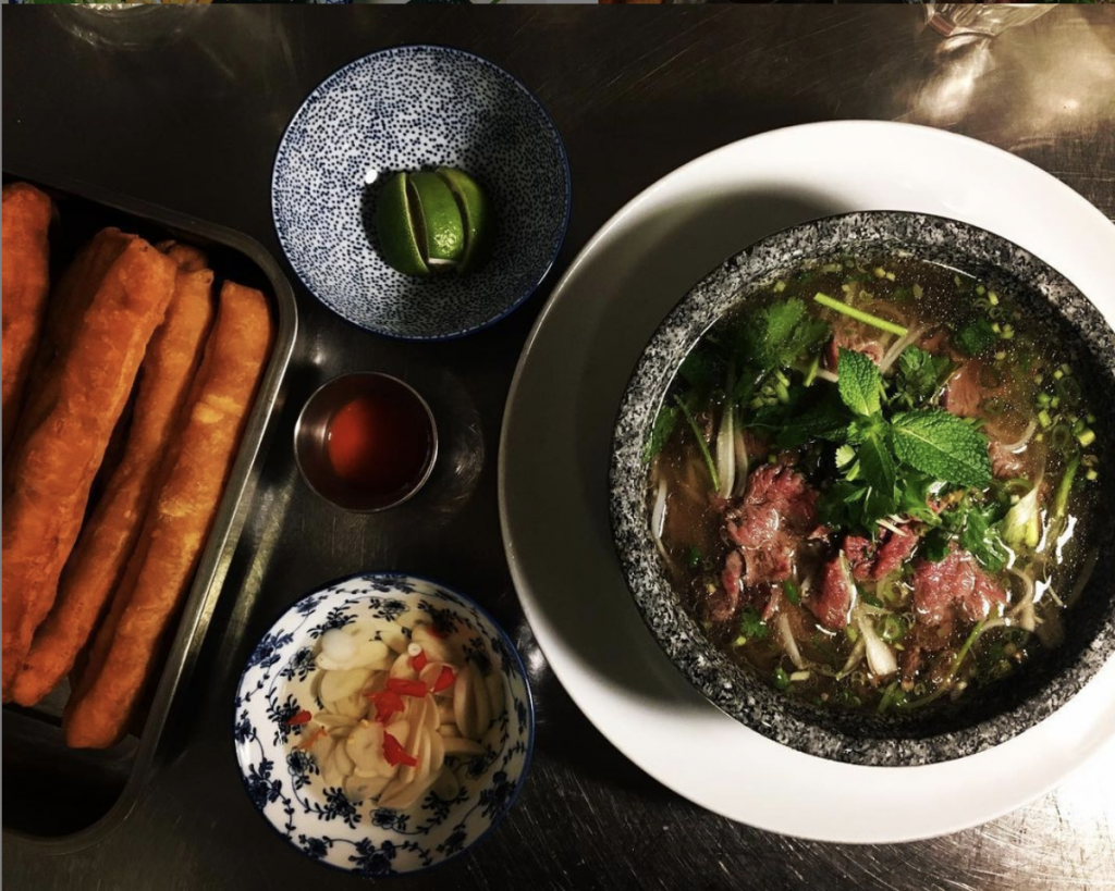 Rice noodle in bone broth soup, served with beef or corn-fed chicken, fresh ginger, coriander, mint and spring onion