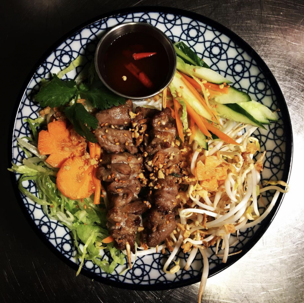 Rice noodle salad dish with meat or vegan option, pickled vegetables, fresh coriander and mint, served with fish sauce (homemade soya sauce for vegan option), garnished with peanut, roasted onion and sesame seed